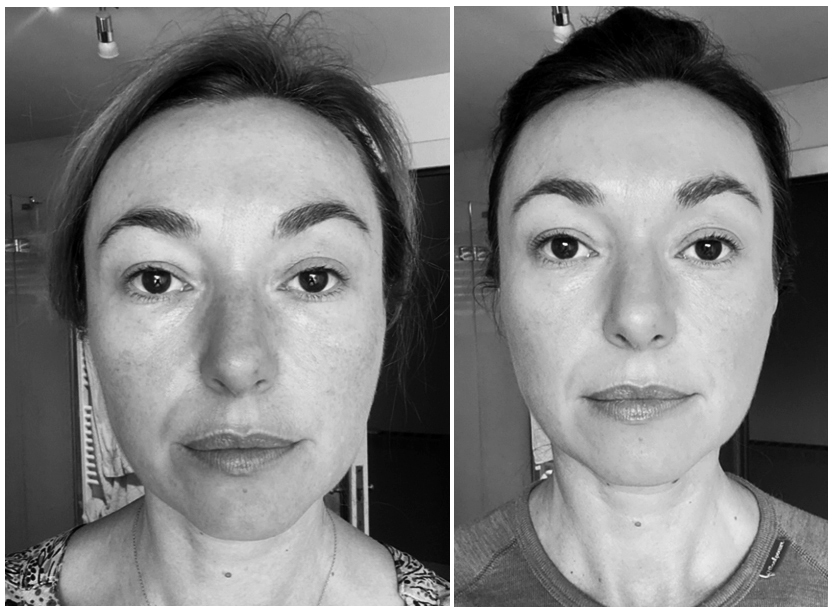 Op de foto hiernaast zie je alvast mijn eigen eerlijk resultaat. Ik draag op geen van beide foto's make-up en ze zijn op hetzelfde tijdstip genomen, zonder filters. De linkse foto is een foto voor ik zelf met Face Yoga aan de slag ging. De rechtse foto is een foto na vijf maanden consequent oefenen. De meest spectaculaire verandering zag ik echter al na zo'n drietal weken. Ik nam deze foto's niet als Face Yoga lesgever, maar om de resultaten van mijn eigen traject objectief vast te leggen. Zoals je ziet is er een verbetering van de teint, een verbetering van mijn lichaamshouding, van mijn gezichtscontouren en een algemeen frissere en meer wakkere uitstraling. En dat zonder dat ik de rest van mijn verzorgingsritueel heb veranderd.